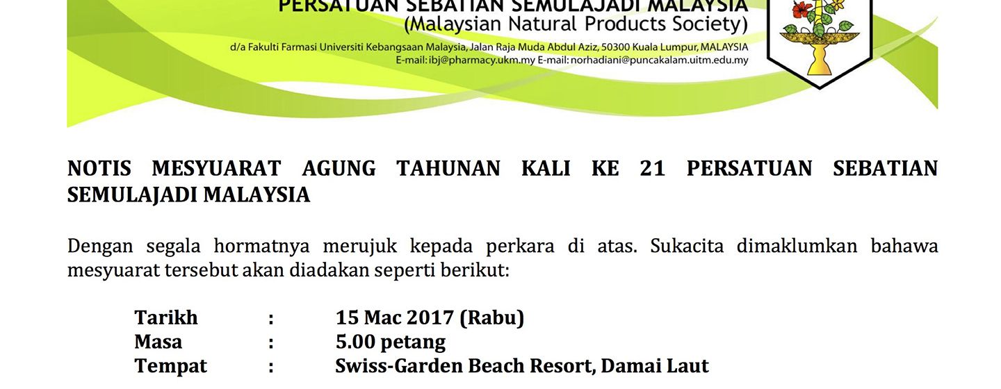 Malaysian Natural Products Society, d/a Atta-ur-Rahman Institute for Natural Product Discovery (AuRIns), Universiti Teknologi MARA, 42300, Puncak Alam, Selangor, MALAYSIA